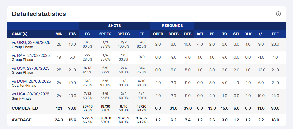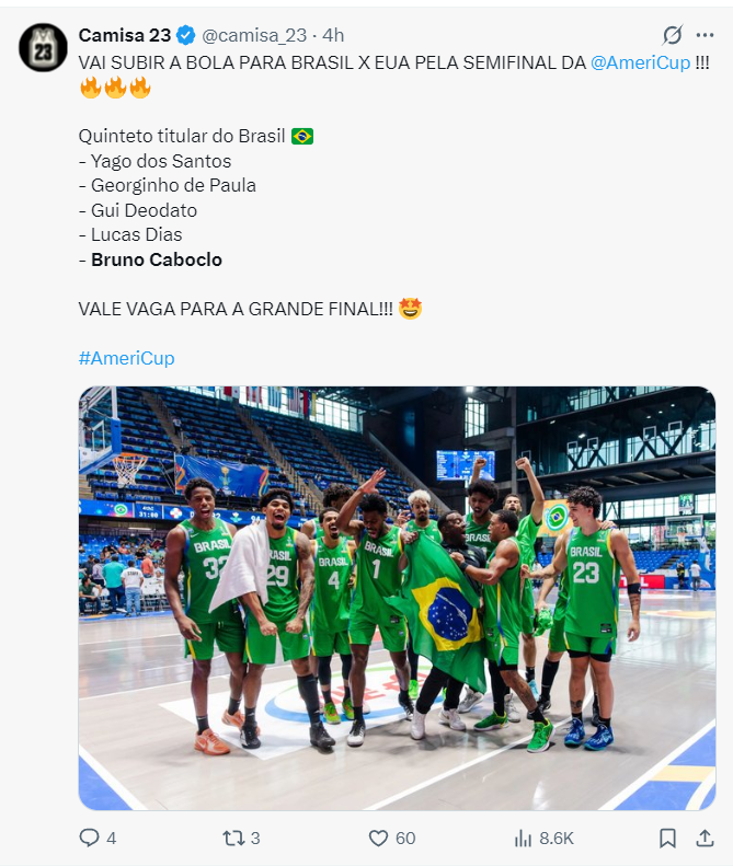 这支巴西男篮晋级美洲杯决赛,卡波克洛、德保拉、迪亚斯、桑托斯都是大功臣,小后卫雅戈-桑托斯成为了本场比赛的MVP,他全场比赛34分钟,14中7,三分6中3,罚球8中8拿到25分12助攻4篮板,命中率50%,但很多人都觉得卡波克洛在末节的发挥更为关键。