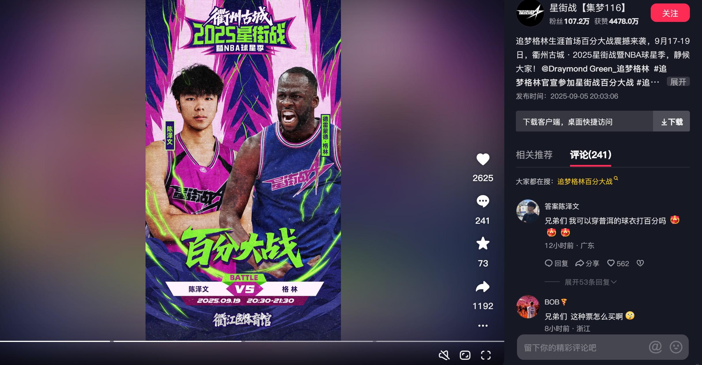 北京时间9月5日,集梦116官方宣布,勇士队球星追梦格林9月19日将来到浙江衢州区体育馆参加生涯首场百分大战。随后追梦格林本人也发布视频证实了这一消息,在视频中他也用中文的“你好”和“谢谢”向大家进行了问候。本次活动将分为3天举行,追梦将会参加最后一天决赛的活动,届时他将会与集梦116球员陈泽文进行比赛。在集梦116官宣的视频留言区,陈泽文也开玩笑地写道:“...